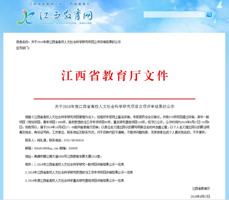 根据《江西省高校人文社会科学研究项目管理办法》,经组织专家网上匿名评审,专家委员会会议审议,共有879项项目通过评审,其中一般项目(规划项目、青年项目)680项、高校思想政治工作专项项目80项、重点研究基地项目119项,现予以公示,公示时间为2019年9月27日-10月9日。如有异议,请于2019年10月9日17:00前向省教育厅反映,以单位名义提出异议的要写明单位名称并加盖公章,以个人名义提出异议的要注明真实姓名、身份证号码、工作单位、联系地址及联系方式,对于反映内容不清晰、不提供问题线索、无举报单位或个人真实姓名的,不予复核。