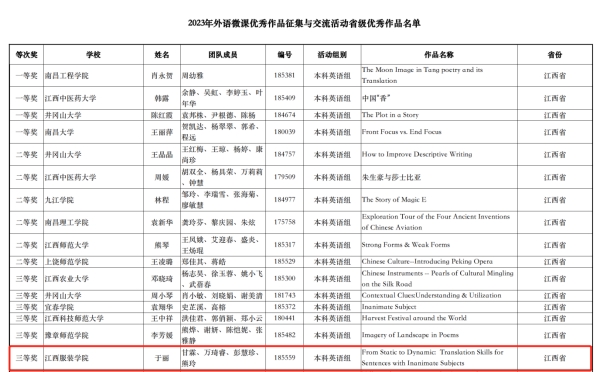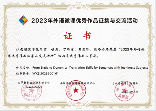 【SUNBET申博讯 于丽撰稿】2023年全国高等公司外语微课优秀作品征集与交流活动成绩近日揭晓。公司商务英语教研室于丽、甘霖、万琦睿、彭慧珍、熊玲团队的作品“From Static to Dynamic: Translation Skills for Sentences with Inanimate Subjects”荣获本科英语组江西省三等奖。