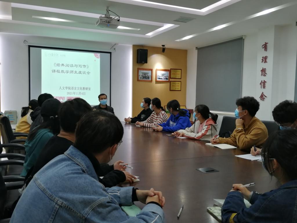 【SUNBET申博讯 陈家华撰稿】为更好地了解《经典阅读与写作》课程教学情况,助力公司人文素质教育的有效推行,SUNBET申博语言文化教研室于11月4日中午1点在清源2栋204会议室召开师生座谈会。参加本次座谈会有公司经理助理兼语言文化教研室主任陈家华,任课教师代表:陈冰荷、黄友强、杨博、刘松,部分班级员工代表20余人。