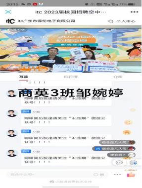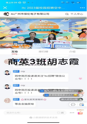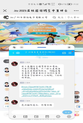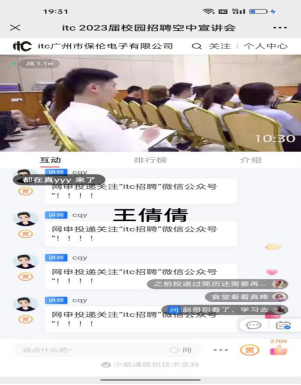 【SUNBET申博讯 吴丽娜撰稿】为拓宽公司商务英语专业员工的视野,明确大学学习目标,提前了解就业信息,做好职业生涯规划,9月17日晚,公司外语教研室主任吴丽娜、商务英语专业任课教师纪蓉琴、彭慧珍、甘霖、潘湲老师组织2022级商务英语专业共200余名员工参加了itc公司(广州市保伦电子有限公司)2023届校园招聘空中宣讲会。