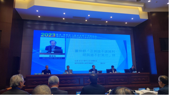 杨博、潘泽中投稿的论文《董仲舒阴阳哲学浅论》收录在本次研讨会论文集。21日下午,在分组学术研讨第一分会场,杨博做了论文汇报。他汇报说:董仲舒以阴阳哲学思想通天人之际,明经权之变,调和儒法,构建了“德主刑辅”的政治伦理框架。通过对思孟学派和申商韩非刑名之学的批判,修正了儒家过于理想主义的激进倾向,奠定了儒家成为中国文化主流思想的基础,为先秦诸子百家争鸣画上了圆满的句号。董仲舒以《春秋》决狱,为秦汉之际统治思想的最终定型做出了重要贡献。在这一过程中,阴阳学说起到了至关重要的作用。董仲舒也是系统论证阴阳五行学说的第一人,为后世阴阳五行学说全面深入影响中国社会生活的方方面面提供了完善的体系和范例。