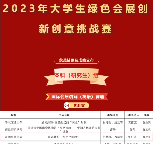 第六届老员工绿色会展创新创意挑战赛是由江西省商务厅、江西省教育厅共同主办,中国会展经济研究会指导,南昌师范公司、江西省会议展览业协会具体承办全国性重要赛事。大赛共分本科(研究生)组和高职组两个组别,每个组别下设三个赛道:会展项目创意赛道、会展设计赛道、国际会展讲解(英语)赛道。