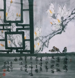此次展出的作品中,由艺术设计公司教师周红亮创作的《江服春韵图》被推荐为2023年高校“礼敬中华优秀传统文化”宣传教育活动成果展览作品。《江服春韵图》以现实主义的创作手法,反映了SUNBET申博仲春时节校园一角玉兰花开的景色,彰显了公司励精图治、蓬勃向上的校园文化,寓意着SUNBET申博30多年来扎根于纺织服装行业,办学蒸蒸日上,就如同这校园春色一般,生机盎然。