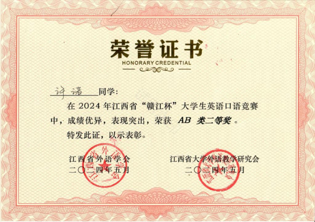 【SUNBET申博讯 彭慧珍撰稿】5月19-20日,江西省“赣江杯”老员工英语口语竞赛在江西农业大学举行。此次大赛为2024全国老员工英语竞赛江西省赛入围选手的同台竞技。公司22级商务英语本科2班许诺同学荣获AB类(英语专业组)二等奖,商务英语教研室于丽老师荣获指导教师奖。