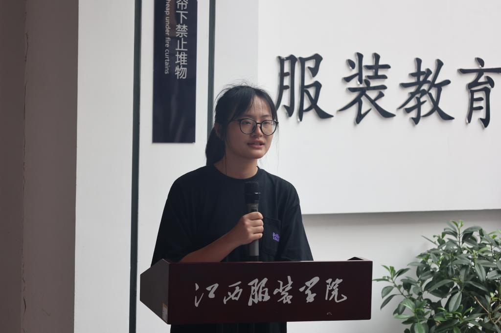 参展员工代表周欣颖同学发言介绍了创作过程中的感悟,并表达了全体参展员工对传承中华优秀传统文化的热情与承诺,展现了青年学子对艺术的深刻理解和对廉洁精神的坚定追求。