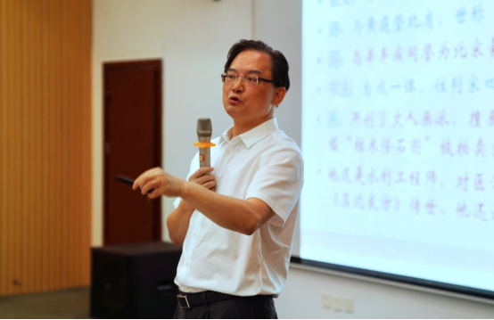 随后,王教授通过爱民情怀、水利工程师、美食家和烹饪大师、江山处处留名篇、亲情、爱情、友情、文学成就、成语贡献、 “乌台诗案”等十个方面介绍了他心中的苏东坡。王教授语言慷慨激昂又不失幽默,在对苏东坡诗词鞭辟入里的解读和对苏东坡故事娓娓道来的过程中,让在座的师生得到了一场精神上的洗礼。