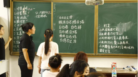 “白石白又滑,搬来白石搭白塔。白石塔,白石塔……”,推普周志愿服务成员寓教于乐,用顺口溜的形式教小朋友们说普通话。为了将普通话在小朋友心中扎下根来,志愿者通过唱歌、朗诵、书写黑板字等活动,设计“沉浸式学普通话”“场景中写汉字”等方法,将普通话以润物细无声的方式教给参加活动的小朋友。