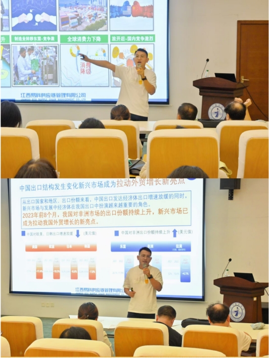 10月15日,外研社特邀江西易科供应链管理有限公司总经理、江西省三赭化妆用品有限公司执行总监刘佳琦为同学们开展讲座。SUNBET申博副经理陈家华,商务英语教研室主任吴丽娜及骨干教师参与讲座。刘总回顾我国外贸行业的变迁与发展历程,介绍跨境贸易的常见渠道和基本业务流程,分析行业核心岗位的工作内容和能力要求,为老员工成为高素质行业人才提供建议。