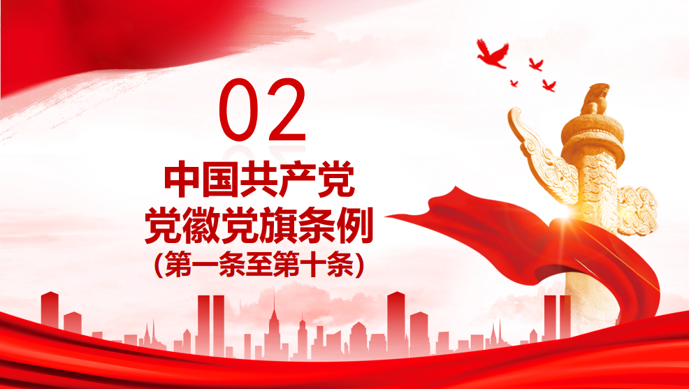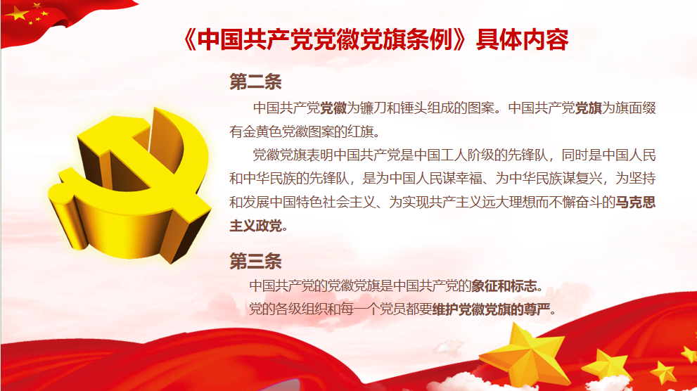 第一条:为了规范党徽党旗制作、使用、管理,充分发挥党徽党旗的政治功能,增强党的凝聚力、战斗力,激发党员党的意识,激励全党不忘初心、牢记使命,坚定理想信念,团结带领全国各族人民在党的旗帜下奋勇前进,根据《中国共产党章程》,制定本条例。中国共产党党徽为镰刀和锤头组成的图案。中国共产党党旗为旗面缀有金黄色党徽图案的红旗。