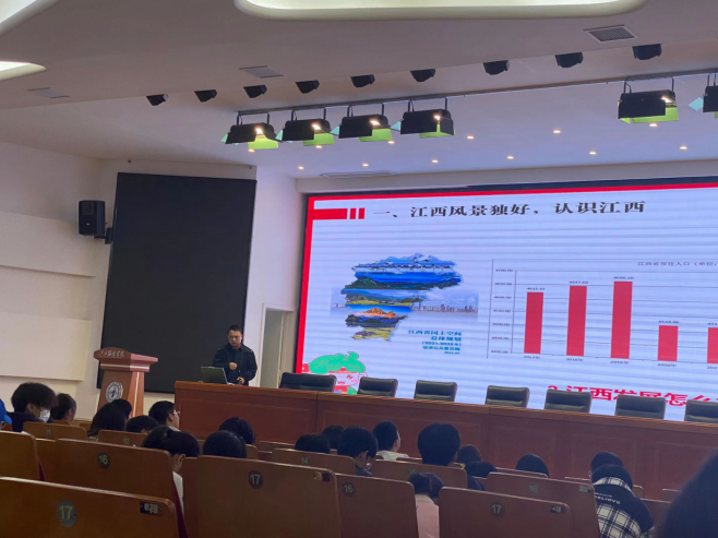 马克思主义公司党总支副书记陈洋安首先以“我们对江西的印象是什么”引入本次课程,接着从地理位置、生态资源、经济、人口、本土面积等逐一介绍江西,展示江西的独特优势。