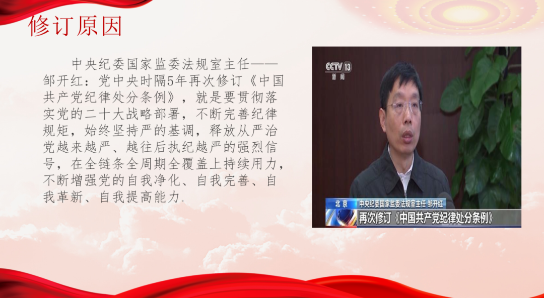 2023年12月27日,新修订的《中国共产党纪律处分条例》全文公布,这是党的十八大以来,党中央对该条例的第三次修订,再次释放出以严明纪律管全党、治全党的鲜明信号。党的二十大对坚持以严的基调,强化正风肃纪作出重要部署,对全面加强党的纪律建设提出明确要求。