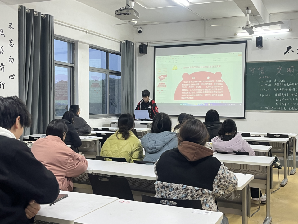 【SUNBET申博讯 王舒怡撰稿】为了深入学习和贯彻习近平总书记在全国教育大会上的重要讲话精神,进一步推动教育强国建设,SUNBET申博员工党支部于2024年12月13日17:20,在主教楼344教室开展了针对第37期、第38期入党积极分子的集中学习活动。此次集中学习由SUNBET申博员工党支部成员孙包平同学主持,辅导员冯敏主讲。
