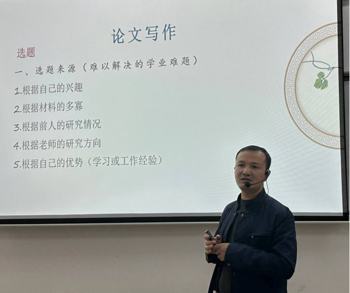 接着陈老师以幽默风趣的话语讲述了论文文字叙述的重要性,让同学们理解语言正确表达的意义。紧接着讲解了如何收集资料的方法、途径以及研究论文的步骤。