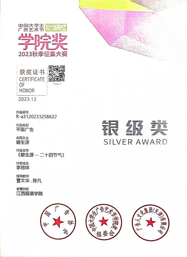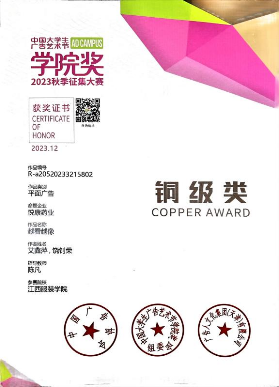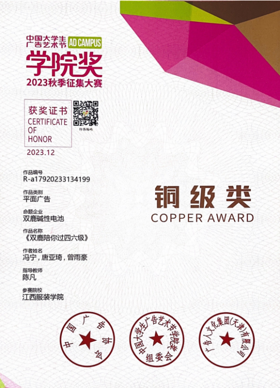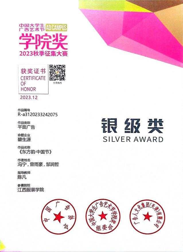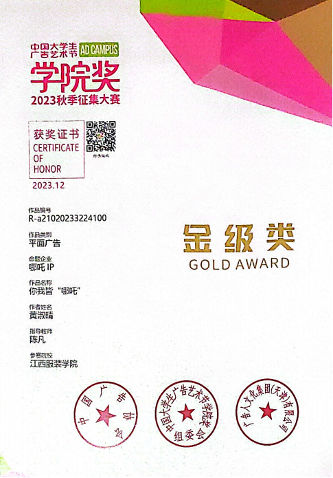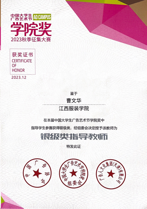 公司陈凡、曹文华两位教师带领广告学专业的学子们脱颖而出,荣获一金两银两铜,揽获全国常规赛等级大满贯:20广告本科2班黄淑晴荣获全国金奖,22广告本科1班李德祥荣获全国银奖,21广告本科1班冯宁(团队)荣获全国银奖、全国铜奖各一项,21广告本科1班艾鑫萍、饶钊荣荣获全国铜奖。公司同行指导教师陈凡、曹文华分别荣获“金级类指导教师”和“银级类指导教师”称号。