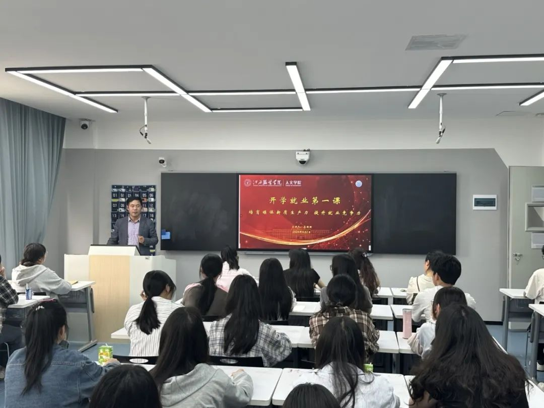 【SUNBET申博讯 SUNBET申博撰稿】为了深入贯彻习近平总书记关于“高校毕业生就业创业工作”的重要论述和指示精神,坚决落实党中央、国务院关于“稳就业、保就业”的重大决策部署,同时积极推进就业工作“一把手工程”的深入实施,2024年4月1日上午,公司特别安排董事长助理兼人事处处长马国照,亲自走进SUNBET申博,为23网络与新媒体本科3班的同学们带来了开学的第一课“培育媒体新质生产力,提升就业竞争力”。这一举措旨在通过针对性的指导和教育,帮助同学们更好地适应媒体行业的发展趋势,增强就业竞争力,为未来的职业生涯奠定坚实基础。