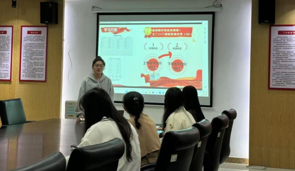 同样来自22商务英语的卢遥同学则以温柔清亮的嗓音,娓娓道来自己丰富的实践经历和杰出的成绩。她的每一句话都充满了坚定和自信,为自己的老员工活描绘出了绚烂多彩的画卷,展现出了青春最好的模样,让人由衷地佩服。