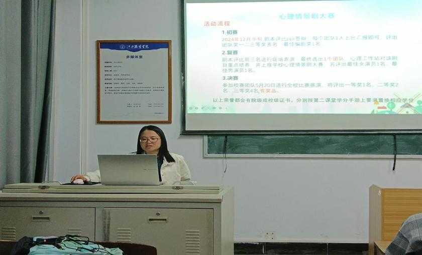 随后,栾老师讲解了心理情景剧大赛活动事宜,心理委员们可以组织班上同学一起参加,制作心理情景剧剧本,紧扣健康向上的心理主题,内容立足老员工活,展示优秀的心理情景剧。在2024年12月中旬将会开展剧本评比ppt答辩,剧本评比的前三名进行复赛,对其剧目重点培养,在明年5月20日左右参加校赛团队决赛。