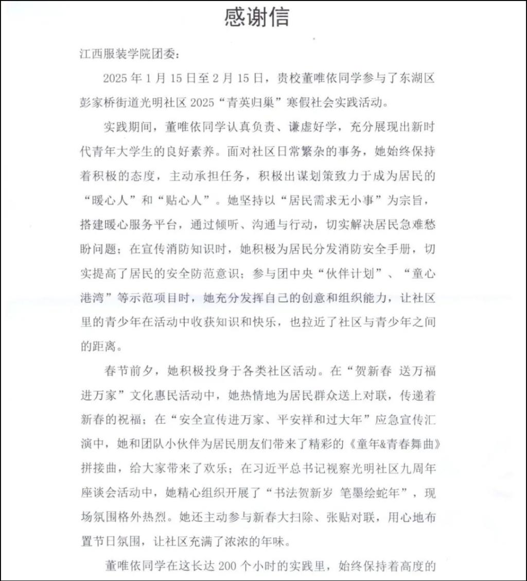 在此次返家乡社会实践活动里,董唯依同学始终保持着高度的热情与专注,全身心投入到各项实践任务中。同时她的积极表现也得到了共青团南昌市东湖区彭家桥街道光明社区委员会的高度关注与认可。近日,共青团南昌市东湖区彭家桥街道光明社区委员会特意发来感谢信,对董唯依同学在实践活动中的突出贡献予以表扬。