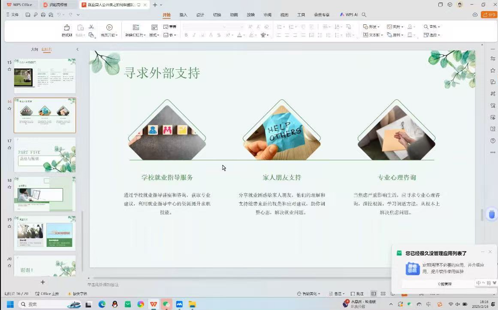 其次老师将同学们遇到的常见的就业心理压力进行分类,主要分为5个方面:1、人际关系困扰;2、孤独感与隔离感以及抑郁与焦虑;3、学业压力;4、身份转换的压力与自我认同危机;5、完美主义倾向,并一一进行分析形成的原因以及提出缓解的方法。