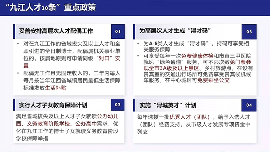 在重点政策方面,九江为各类人才提供了优厚待遇。对高层次人才,不仅妥善安排其配偶工作,实施人才子女教育保障计划,还为A - E类人才生成“浔才码”。凭借此码,人才可以享受免费健康体检、就医绿色通道、旅游景点免费参观等一系列服务;此外,“浔城英才”计划每年选拔优秀人才(团队),并给予经费支持。