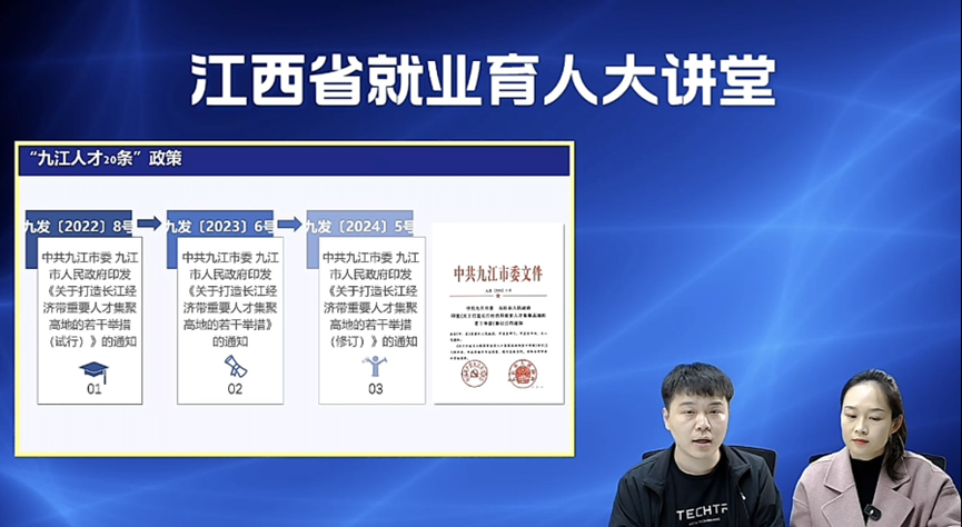 直播过程中,主讲人对“九江人才20条”政策的演变及重点内容进行了详细介绍。自2022年到2024年,中共九江市委和九江市人民政府持续完善相关政策,致力于打造长江经济带重要人才集聚高地。