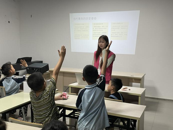 活动伊始,志愿者们用亲切笑容和有趣互动迅速拉近了与孩子们的距离。随后,开启五四精神相关知识讲解环节。志愿者化身时光引路人,借助精心制作的图文资料,将百年前那段波澜壮阔的历史娓娓道来。孩子们目光灼灼,满是对历史知识的好奇与渴求,全身心沉浸在这场跨越时空的精神对话之中。