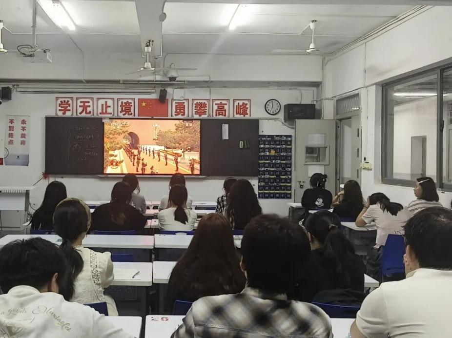 教室里,气氛庄重而热烈。同学们整齐就座,全神贯注于银幕上震撼人心的画面。受阅将士们铿锵有力的步伐、英姿飒爽的阵容、现代化武器装备的磅礴气势,无不展现着国家的发展成就与捍卫和平的坚定决心。同学们时而为恢宏的场面所震撼,时而因激昂的旋律而心潮澎湃,在这场视觉与心灵的盛宴中,真切感受到了大国荣光与喷薄而出的民族自豪感。