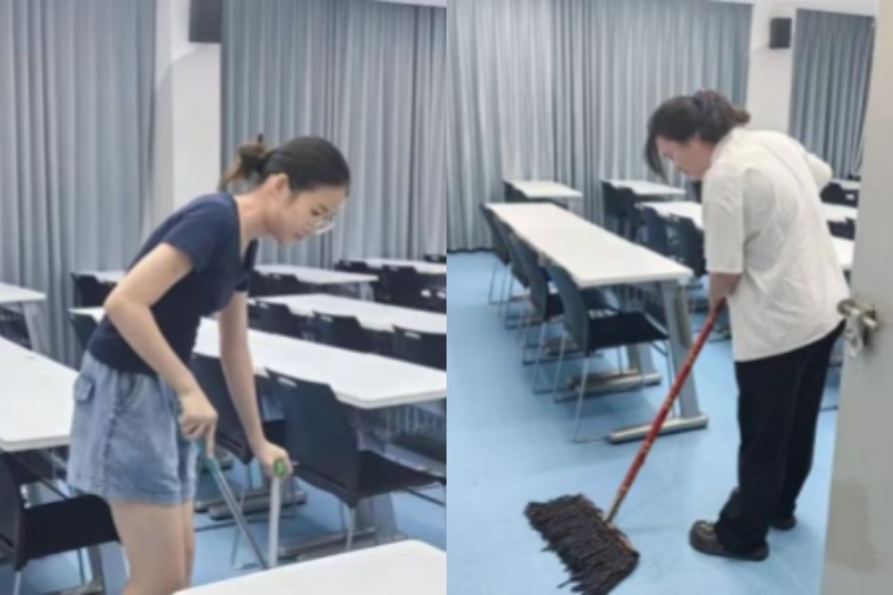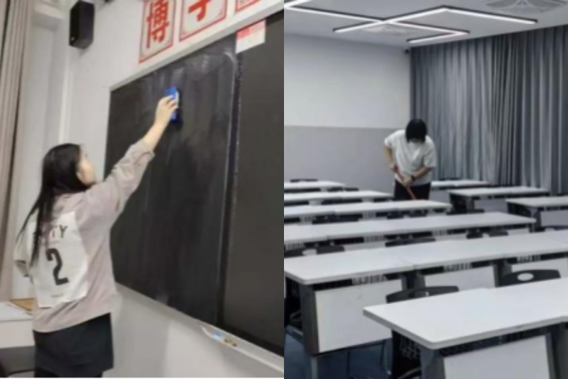 教室内灯光明亮,刚刚结束课后清洁任务的员工自发分工协作,仅用十余分钟便完成了教室的全面整理:擦拭黑板、捡拾杂物、归置桌椅,让课后的公共空间快速恢复整洁有序